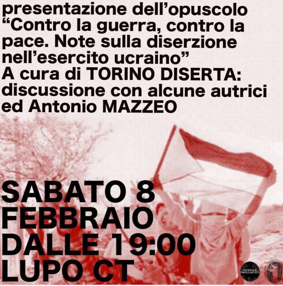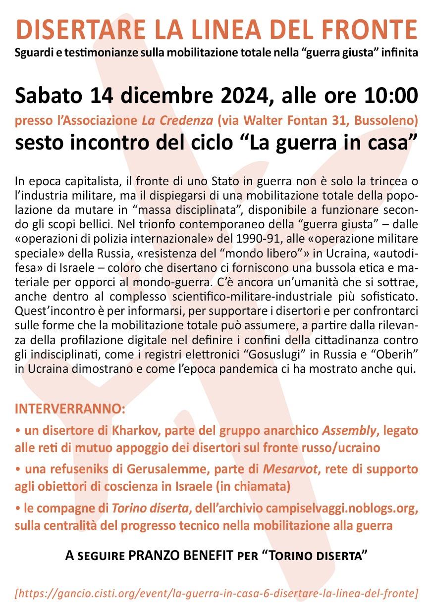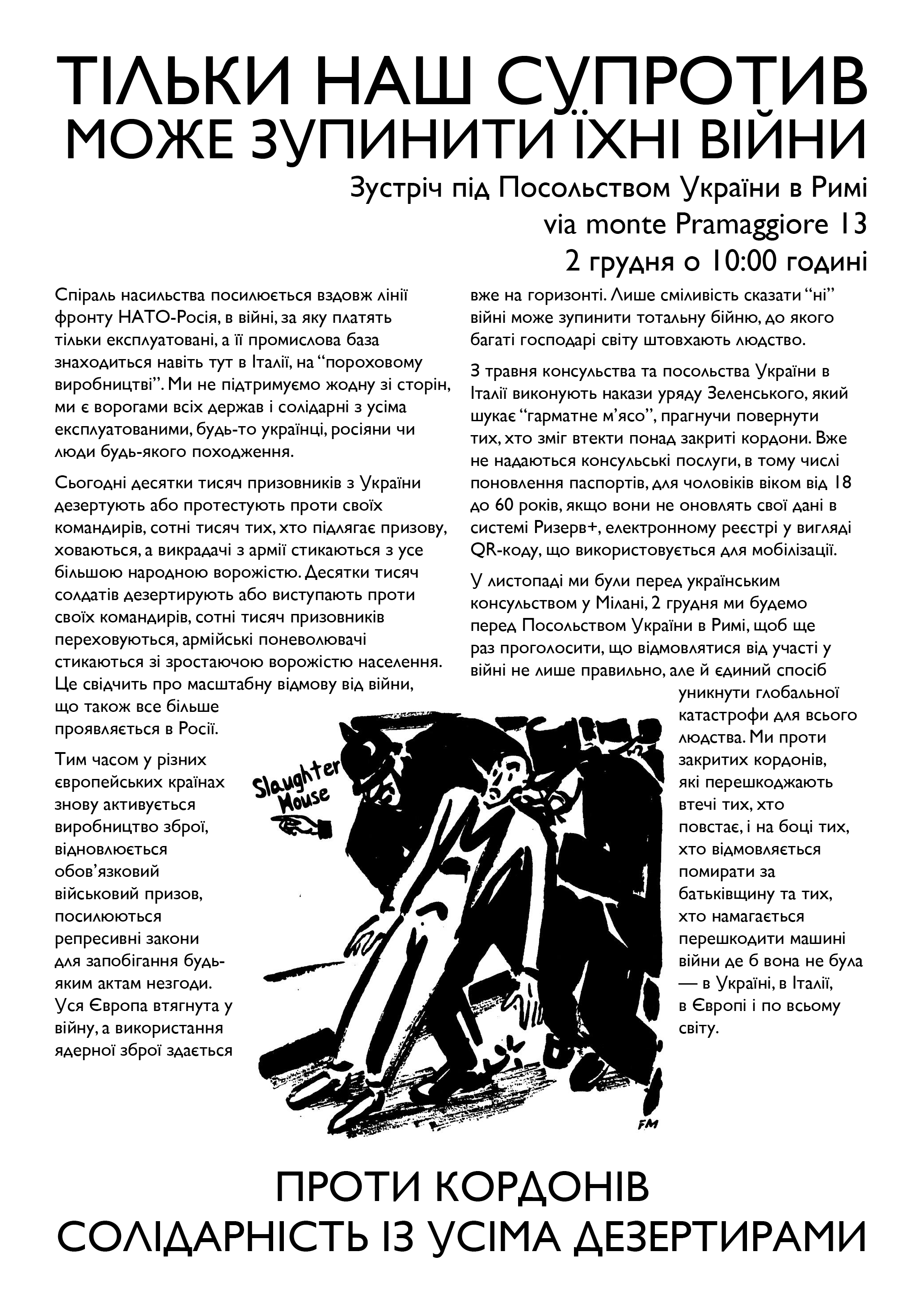A novembre eravamo davanti al Consolato ucraino di Milano, il 2 dicembre saremo davanti all’Ambasciata ucraina di Roma per ribadire che rifiutarsi di combattere non solo è giusto, ma è l’unico modo per evitare un disastro globale per l’umanità intera. Contro le frontiere chiuse per impedire la fuga di chi si ribella, dalla parte di chi si rifiuta di morire per la patria e di chi cerca di ostacolare la macchina della guerra ovunque, in Ucraina, in Italia, come nel resto dell’Europa e del mondo.