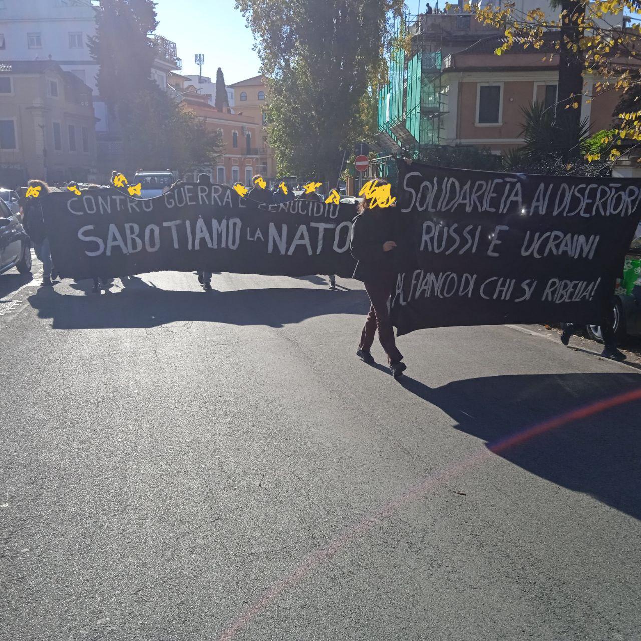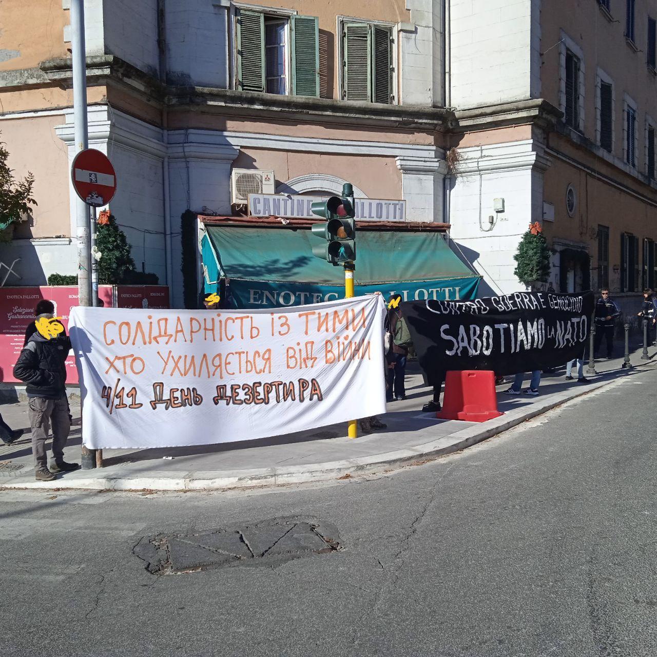 “Nelle ultime settimane si sono tenute manifestazioni contro la guerra in Italia, Germania e Francia. Esprimono solidarietà con fuggiaschi e disertori, contro la repressione che colpisce coloro che non vogliono combattere, e criticano i regimi al potere a Mosca e Kiev. La francese CNT-AIT sostiene le proteste internazionaliste degli attivisti russi e ucraini. In Italia, l’iniziativa anarchica italo-ucraina “Campi Selvaggi” partecipa attivamente alle azioni antimilitariste con trasparenza: “Solidarietà con coloro che disertano la guerra”. Il 30 novembre, i suoi membri sono andati a una manifestazione contro le guerre a Roma, con gli slogan: “Contro la guerra e il genocidio, sabotiamo la NATO”; “Solidarietà con i disertori russi e ucraini, dalla parte di coloro che si ribellano” . Il 2 dicembre è stato organizzato un picchetto davanti all’Ambasciata ucraina nella capitale italiana e nel vicino mercato: “Contro la guerra, che bisogna fare: sabotare e disertare!” ; “Con i disertori russi, con i disertori NATO, il nostro nemico è lo Stato”; “Economia di guerra, disastro nucleare, è venuta l’ora di fargliela pagare”, ecc. Il 19 dicembre i compagni hanno partecipato al blocco della corporazione militare Leonardo SPA a Tessera (Venezia). Un compagno è stato catturato dalla polizia. In Germania, i fuggiaschi dai paesi dell’ex Unione Sovietica sono sostenuti dal movimento locale contro la guerra e pacifista. Il 14 dicembre, a Norimberga, dove si trova l’Agenzia federale per la migrazione e i rifugiati, si è tenuta una manifestazione con la partecipazione di circa 200 persone (…)”.