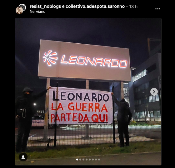 “In un freddo e tardo pomeriggio di venerdì 17 gennaio ci siamo avvicinati il più possibile alla sede di Leonardo spa Divisione Elettronica di Nerviano (Milano) per ricordare a tutte e tutti che anche – e soprattutto – alle nostre latitudini si producono strumenti di guerra. Un po’ di vernice, qualche striscione, qualche volantino. Un piccolo segnale, da cui però partiamo. NO ALLA GUERRA“.